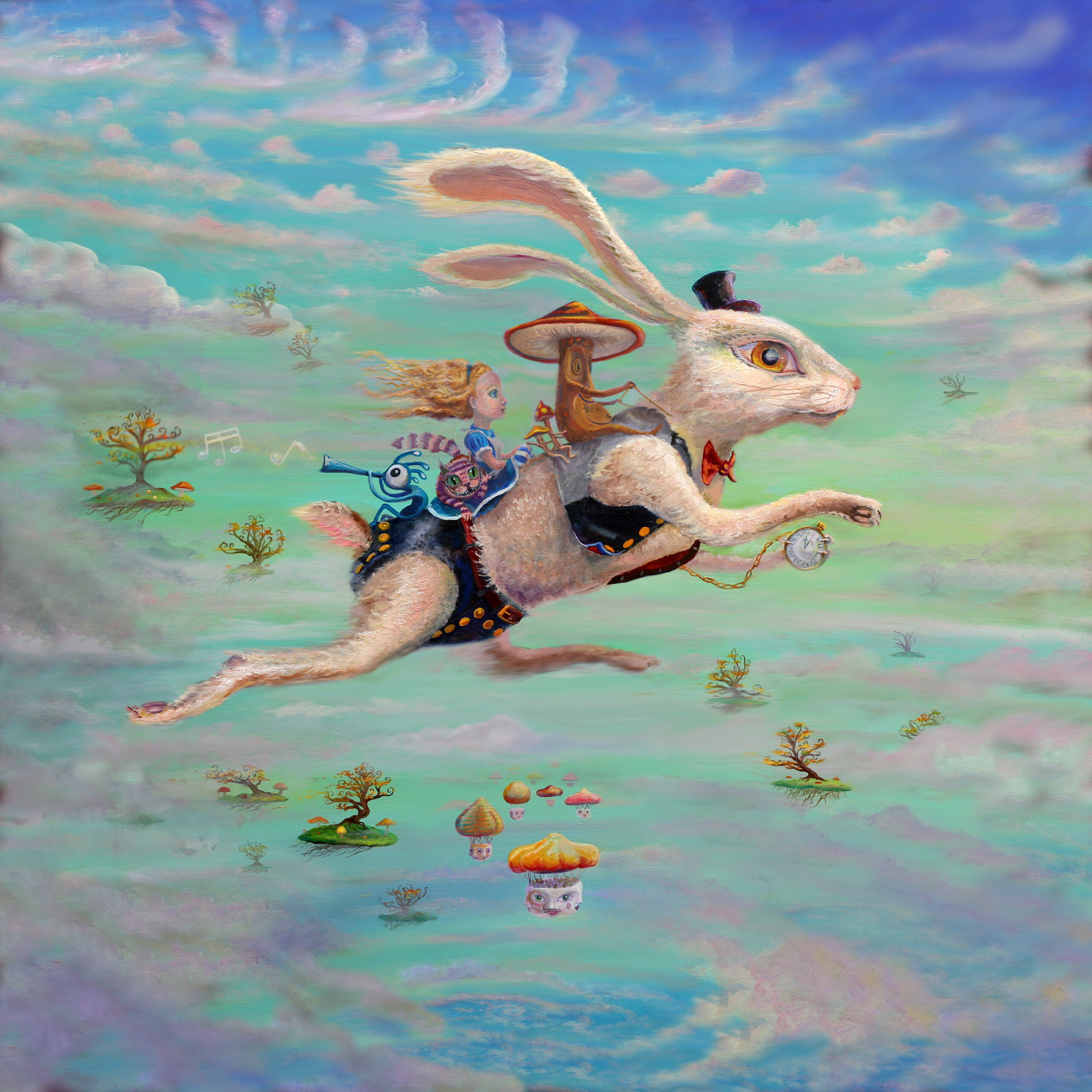 The White Rabbit, always in a hurry, takes Magic Mushroom Buddha, Alice, Kokopelli and the Cheshire Cat to the next Tea Party.